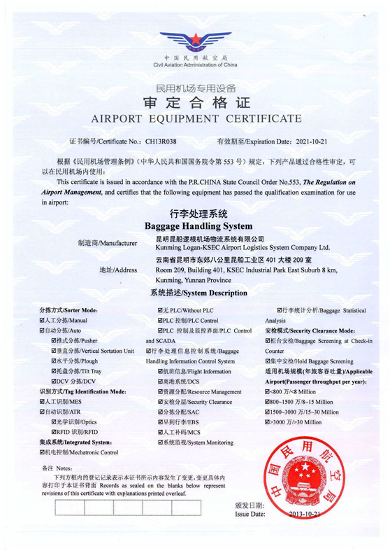 中國民航局授予的集成資格審定合格證