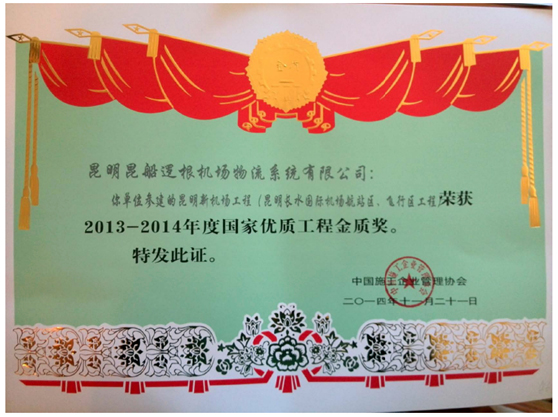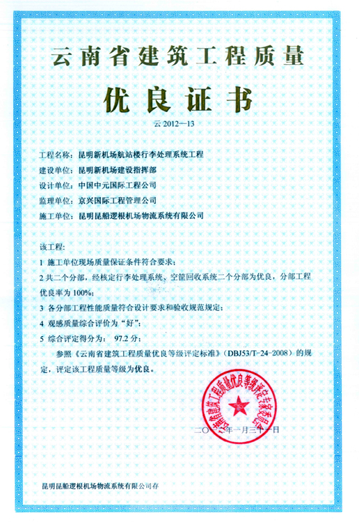 云南省建筑工程質量優良證書